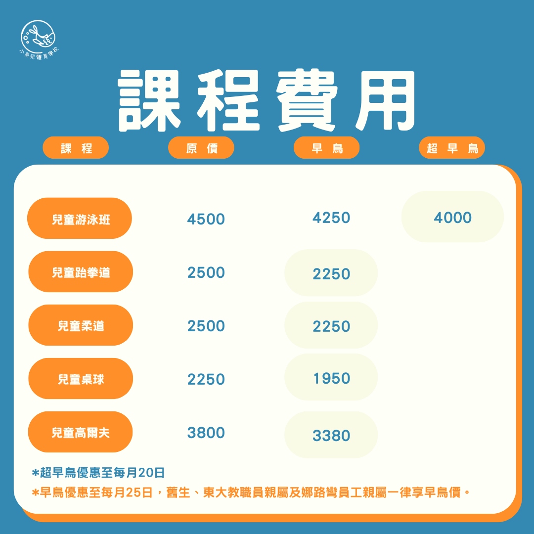 平日/假日體育課程:游泳班、柔道、跆拳道 招收年齡:5歲以上。 地點:台東娜路彎大酒店(台東市連航路66號) ★柔道、跆拳道課程限時優惠★ 一次報名三個月送價值2000元娜路彎大酒店SPA券 一次報名六個月送一期游泳課!