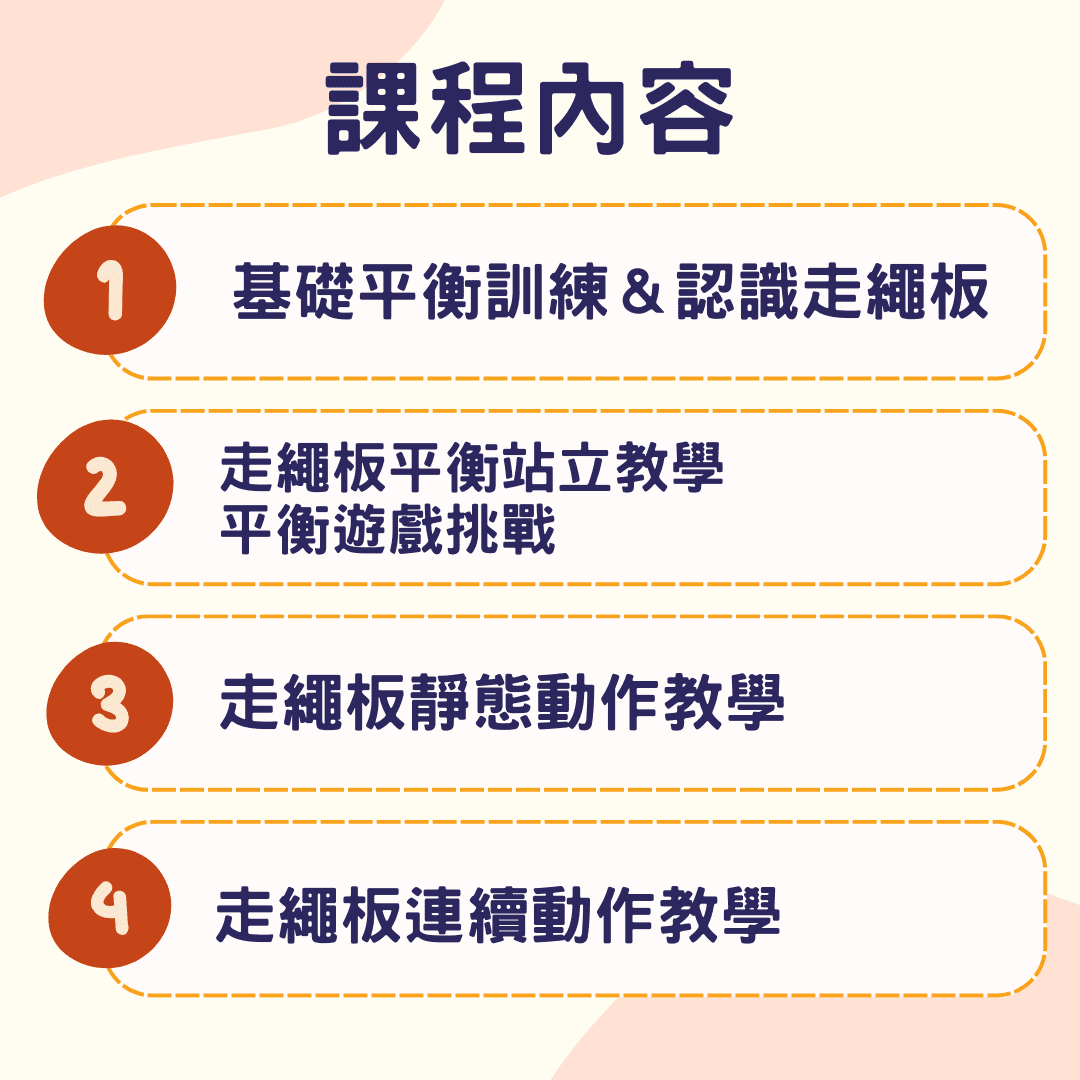 2025.10-12月 新北永和 走繩板課 新北永和X結合「走繩」及「滑板」的走繩板課程 日期:2025/10/13(一)至 12/1(一),共8堂課 2025.10.13 2025.10.20 2025.10.27 2025.11.03 2025.11.10 2025.11.17 2025.11.24 2025.12.01 時間:每週一17:00 -17:55 費用:一期3200元/8堂課 報名網址:我要報名 年齡:6歲至12歲 人數:限 8 人(未滿 4 人將取消活動) 上課地點:永和Class 1 運動教室 (新北市永和區豫溪街38號)