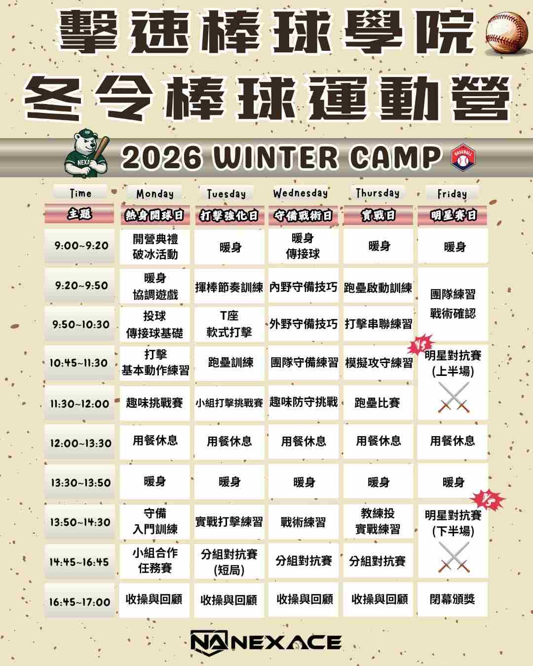由專業教練團隊打造五天豐富棒球課程,不僅有扎實的棒球課程,也會有趣味競賽、分組對抗賽等活動!讓小朋友們運動的同時也能學習到團隊合作。