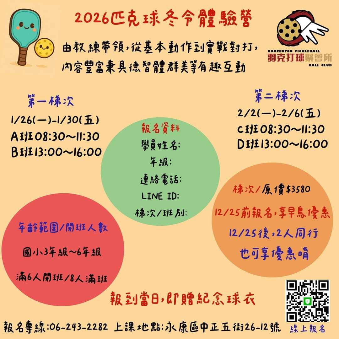 由專業教練帶領,從基本動作到實戰對打,透過遊戲提升手眼協調、反應力與專注力。匹克球上手快、節奏友善,結合網球、羽球、桌球特色,是寒假入門球類運動的最佳選擇!